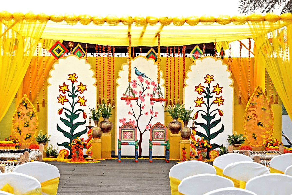 We design colorful, vibrant setups using marigold flowers, drapes, umbrellas, swings, traditional props, and thematic décor—perfect for pre-wedding ceremonies filled with joy and tradition.