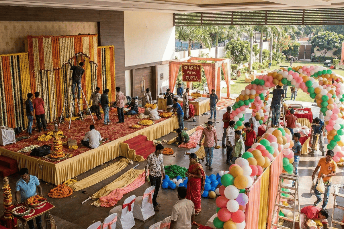 We design complete wedding décor—haldi, mehndi, sangeet, and reception—crafted to match your theme.
