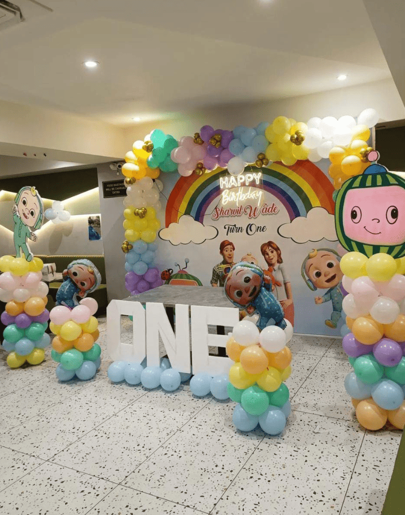 Rainbow balloons, cute characters, and playful elements bring a fun-filled vibe to a child’s first birthday celebration. Designed to make little moments magical.